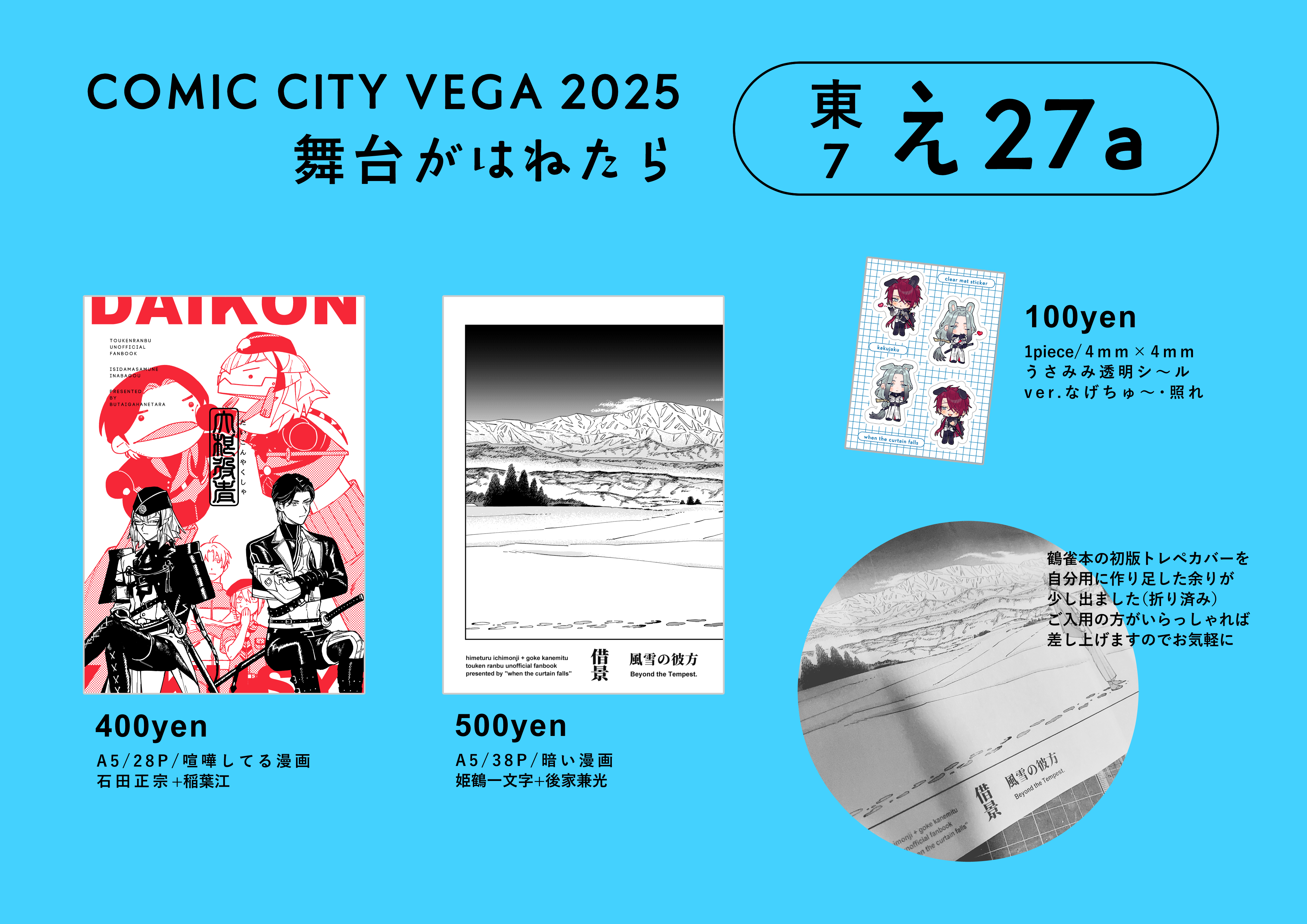 誘われてノリで申し込んだら裏切りに遭い、一人ベガに取り残され、ほどほどのモチベで原稿しています🎶福ちゃんの本が出るか、京極の紙があるか上杉描いてるか童子切の内容によっては津山描いてる可能性がある。close