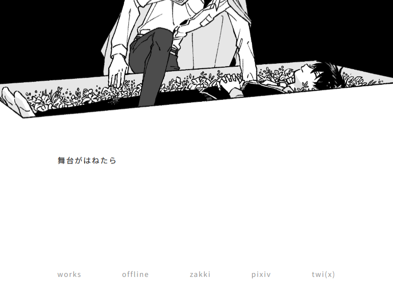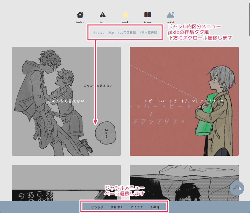 カプ物書いてるジャンルは一番上にカプ無しや足し算系の作品群、以下は全部カップリングコーナーという分け方にしているので、スクロールの際に気を付ければいい感じに眺められるんじゃないかと思います。