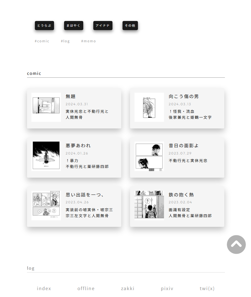 レイアウトをめんどくさくさせてる主な理由がジャンルやカップリングの有無 漫画 落書き 文章 なんかの細かい仕分けが必要なとこだと思う。あと 動線をシンプルに・階層浅く が譲れねえ。来年も元気に生きてたらワードプレスに移行してみようかな。close